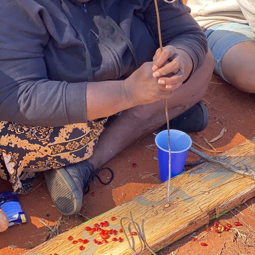 Led my Yuendumu elders Alice Nelson the on-Country workshops featured red bean jewellery making. Red Dust team supported the community to create some activities that could increase calm, reduce stress and engage Yurrumpi youth in their culture.