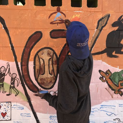 The program brought together many of the students to create their own mural inspired by the school's values, pukurl-pukurlpa, yulkanjaku, and jintangka. While it is difficult to translate from Warlpiri to English the exact meaning, the sentiment of these words talk about being proud, being happy, caring for each other and together as one.